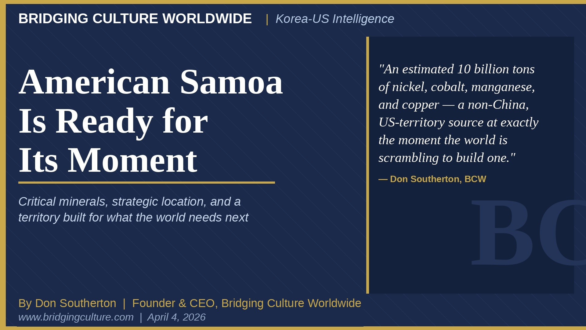 The engagement builds on a 2024 Memorandum of Understanding between ASEDC and Critical Mineral Ventures, through which BCW Founder & CEO Don Southerton has been working to develop American Samoa’s deep-sea offshore critical mineral resources as a strategic non-China supply solution. The initiative aligns directly with the Trump administration’s executive actions on critical mineral supply chain security, domestic and allied-nation sourcing, and accelerated development of U.S. offshore mineral assets.